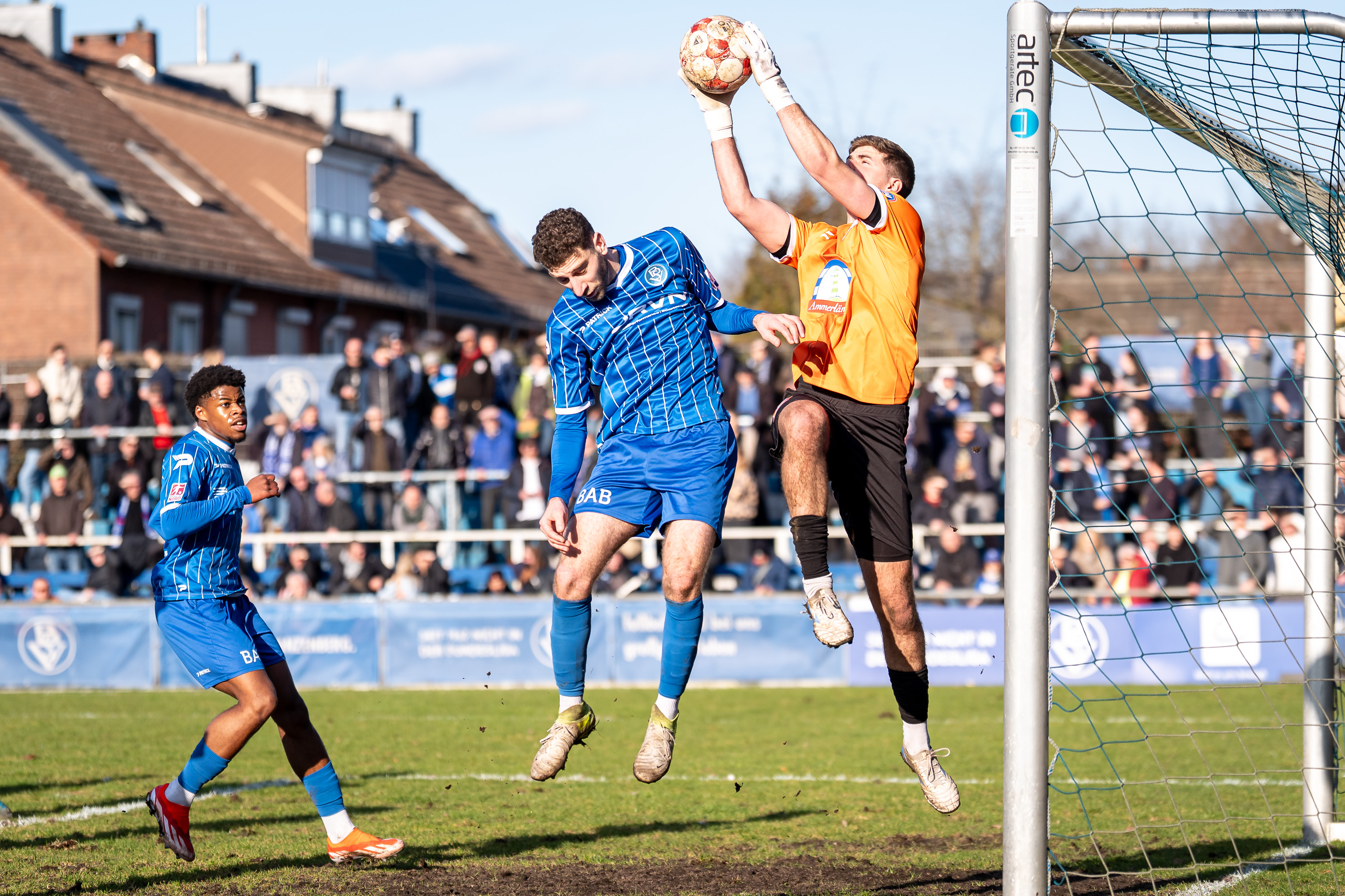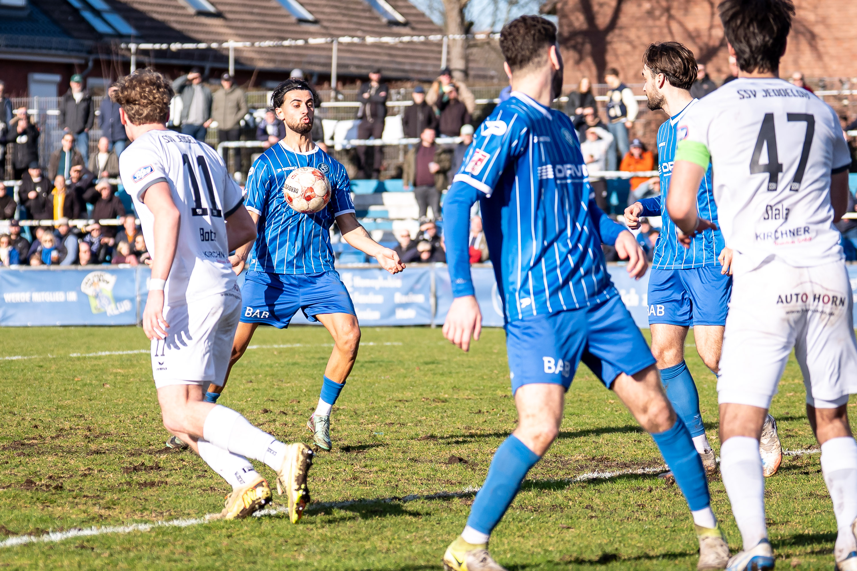 Während der BSV viele kleinere, aber nicht zwingende Chancen kreieren konnte, ließen sich die Gäste aus Jeddeloh mehr fallen und lauerten auf Fehler der Hausherren. So kam es in der 28. Minute zu einer gefährlichen Chance für Jeddeloh, als eine Flanke von rechts im Fünfmeterraum landete und der resultierende Kopfball noch von Manitz pariert werden konnte. Kurze Zeit später stand Manitz erneut auf dem Prüfstand, als Kasra Ghawilu einen Freistoß in der Nähe der Eckfahne direkt aufs Tor brachte. Im Gegenzug bekamen unsere Jungs noch einen Eckball. Busch brachte diesen auf Gröger zum zweiten Pfosten, dessen Kopfball noch auf der Linie von Moritz Ben Onken geklärt werden konnte.
